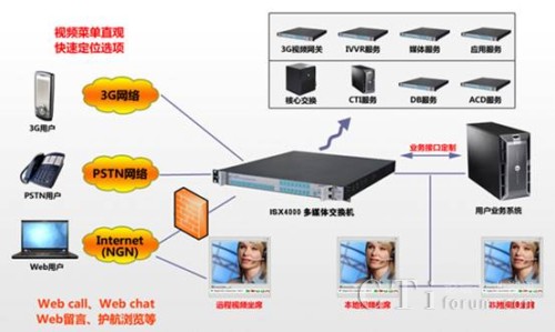 基于毅航通信ISX4000多媒體交換機的IVVR或視頻呼叫中心系統(tǒng)平臺可同時支持3G網(wǎng)絡(luò)、2G以及Internet網(wǎng)絡(luò)的接入;支持視頻、語音、傳真、郵件、短信等全方位服務(wù)模式;支持集中和IP分布式部署,座席數(shù)隨時隨地任意伸縮,可輕松形成一個跨區(qū)域、集語音和視頻于一體、統(tǒng)一的視頻呼叫中心系統(tǒng)。