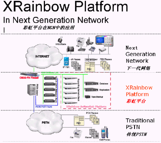 Xrainbow軟交換平臺(tái)它是基于SIP協(xié)議、針對(duì)中國現(xiàn)有Internet網(wǎng)絡(luò)狀況和現(xiàn)有網(wǎng)路硬件服務(wù)商的VoIP 設(shè)備的特點(diǎn),為電信運(yùn)營商和二級(jí)/虛擬運(yùn)營商, 通信系統(tǒng)集成商提供運(yùn)營于下一代新網(wǎng)絡(luò)(NGN, Next Generation Network)之上的一套集VoIP 語音及信號(hào)交換、管理及服務(wù)于一體的電信級(jí)系統(tǒng)平臺(tái)。X彩虹SIP軟交換系統(tǒng)包括以下的核心服務(wù)器如下認(rèn)證服務(wù)器、路由服務(wù)器、配置服務(wù)器、功能服務(wù)器、語音郵件服務(wù)器、媒體轉(zhuǎn)發(fā)服務(wù)器和網(wǎng)絡(luò)管理服務(wù)器。我們的系統(tǒng)可以實(shí)現(xiàn)多種功能,功能模塊包括:監(jiān)控模塊、計(jì)費(fèi)模塊、管理模塊、話吧模塊、代理商模塊、軟電話模塊、集團(tuán)功能模塊、電話卡模塊、主叫認(rèn)證模塊、回?fù)苣K、批發(fā)計(jì)費(fèi)模塊、電話會(huì)議模塊等。
