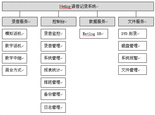 NetLog語音記錄系統(tǒng)采用基于分布式、多層控制管理體系的設(shè)計思想,將電話線路與內(nèi)部網(wǎng)絡(luò)有效地結(jié)合在一起,形成一套完整的語音錄制、管理系統(tǒng)。采用目前先進(jìn)的C/S模型,能更方便、快捷地實現(xiàn)控制臺對網(wǎng)絡(luò)內(nèi)所有記錄服務(wù)的狀態(tài)監(jiān)視,記錄查詢,操作控制等,采用統(tǒng)一的管理化機(jī)制,使文件的管理和備份更簡潔。