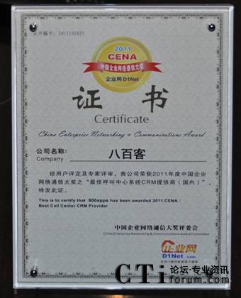 CTI論壇(ctiforum)10月31日消息(記者 張潔):10月19日,2011 秋季CENCE 中國企業(yè)網絡通信大會暨云計算高峰論壇在上海展覽中心盛大舉行。國內首家SaaS廠商八百客憑借連續(xù)在云計算領域的成熟技術以及在市場中的廣泛認可度,獲得“最佳呼叫中心系統(tǒng)CRM提供商”大獎。
