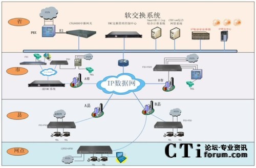 IP電話系統(tǒng)項目方案設(shè)計共分省、地州市、縣(市)三級進行部署,按照省集團至地州市分集團、縣(市)級分集團及營業(yè)廳建設(shè),全網(wǎng)通過部署相應(yīng)的IP電話設(shè)備(含語音軟交換、接入網(wǎng)關(guān)、PC軟電話、網(wǎng)管軟件、計費軟件等),組建全省IP電話系統(tǒng)。