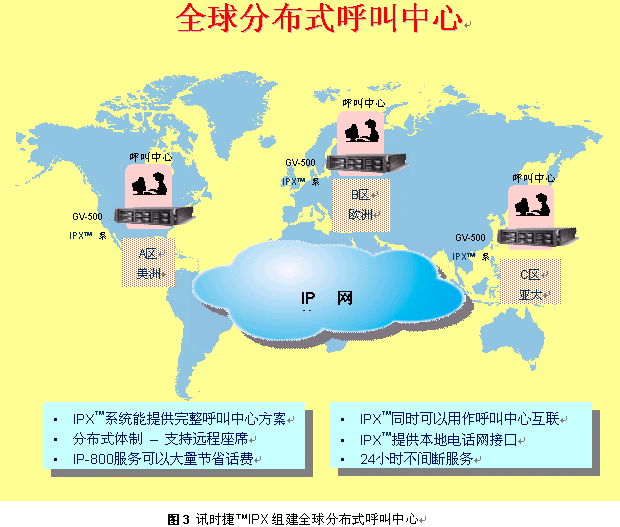 將客服人員辦公地點(diǎn)設(shè)立在人力成本相對低廉的地方,在其它需要有客服的地方架設(shè)帶FXO的語音網(wǎng)關(guān),將該網(wǎng)關(guān)注冊到訊時捷 IPX上,將當(dāng)?shù)乜头娫捵詣愚D(zhuǎn)入到公司總部的訊時捷