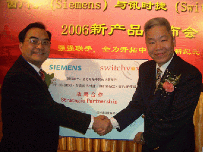 2006年3月29日的北京,還有些春風(fēng)料峭,但北京長富宮的芙蓉廳卻是暖意融融,德國通訊業(yè)巨擘西門子(Siemens)和美國企業(yè)通訊業(yè)新寵訊時捷(Switchvox)聯(lián)合舉辦VoIP新產(chǎn)品發(fā)布會,西門子終端通訊設(shè)備(上海)有限公司CEO Tony Tang先生和美國訊時捷公司中國辦事處首席代表Francis Hung先生到會,并在現(xiàn)場宣布兩家公司在VoIP領(lǐng)域結(jié)成戰(zhàn)略合作伙伴,共同推動VoIP在中國的應(yīng)用。大會吸引了來自全國的渠道代表、廠商、集成商和在京媒體120多人參加。