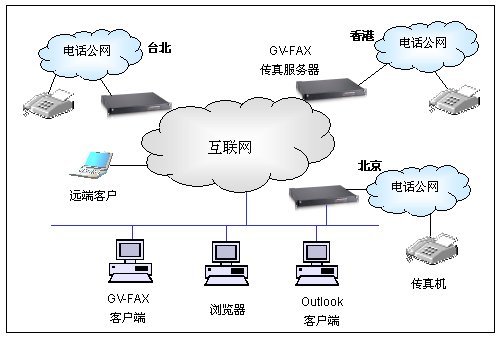 GV-FAX網(wǎng)絡傳真服務器IP傳真拓普圖如下所示,以某集團有三家分公司,分布在北京、臺北和香港三地為例: