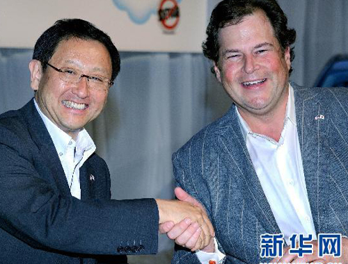 5月23日,日本豐田汽車公司總裁豐田章男(左)和美國Salesforce.com網(wǎng)站首席執(zhí)行官馬克・貝尼奧夫在東京共同出席新聞發(fā)布會。