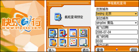 “快樂e行”預(yù)裝在手機(jī)中的存儲(chǔ)卡中,可直接安裝到手機(jī)的應(yīng)用菜單欄里,點(diǎn)擊圖標(biāo),就可以直接進(jìn)入首頁。圖形化的操作按鍵、簡明的文字提示、順暢的操作流程,人性化的設(shè)計(jì)讓機(jī)票預(yù)訂變得不再麻煩。