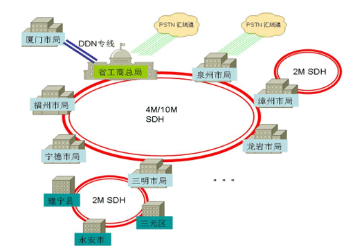 SDH專(zhuān)線連接下轄各縣區(qū)局,組建成全省范圍的工商系統(tǒng)專(zhuān)網(wǎng)。