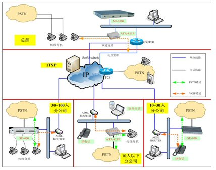 3.10至30人的分公司:通過(guò)增加桌面型IP-PBX(SE-30)及IP話機(jī)終端的方式改造。SE-30提供2路Bypass口,當(dāng)網(wǎng)絡(luò)中斷時(shí),可以作為連接PSTN的中繼端口;用戶終端采用IP話機(jī)或語(yǔ)音網(wǎng)關(guān),實(shí)現(xiàn)小規(guī)模的網(wǎng)絡(luò)電話應(yīng)用。