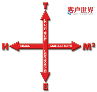 THEM2方法把呼叫中心看成是由技術(shù)(Technology)、人(Human)、環(huán)境(Environment)、管理(Management)組成的整體。這個(gè)方法的圖示是一個(gè)十字架(見圖一),M之上的2字的意思是說,所考慮的管理包括戰(zhàn)略管理(Strategic Management)和運(yùn)營(yíng)管理(Operational Management)兩個(gè)層面。