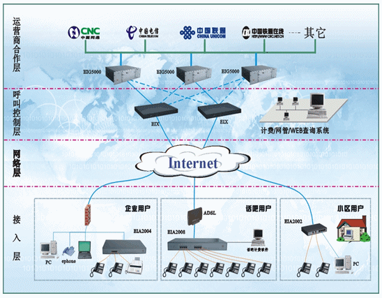 - 在運營商合作層,EIG5000系列是集軟交換為一體的數(shù)字中繼網關,與傳統(tǒng)運營方案比減少了設備投入,更加保證可靠方便的應用,EIG5000系列可以配合網管系統(tǒng)、計費系統(tǒng)、WEB管理系統(tǒng)組成整個完整的局端運營系統(tǒng),而增加EIX7100設備可以更好的冗余備份,使整個運營平臺更加穩(wěn)定。EIA設備根據客戶類型和需求配置相應的設備;