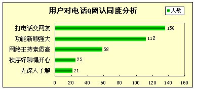 在參與調(diào)查用戶中有266位用過其他電話Q吧產(chǎn)品,但其中82%的用戶認為電話Q網(wǎng)更吸引人。由此可見,電話Q網(wǎng)“電話直通互聯(lián)網(wǎng),交友就要交網(wǎng)友”的強大功能和定位,有效促進了用戶對于Q網(wǎng)系統(tǒng)完善、功能先進的認知,并使電話Q網(wǎng)和其它Q吧相比建立起顯著的市場區(qū)隔和優(yōu)勢。