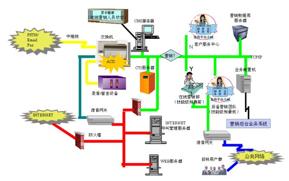 來自于公網(wǎng)的電話經(jīng)過交換機處理,經(jīng)過坐席人員判斷是否是銷售線索?然后轉(zhuǎn)接到相關(guān)的銷售代表處進行接聽,在線營銷,同時營銷人員在空閑時間通過客戶數(shù)據(jù)庫進行外呼,挖掘商機進行銷售。