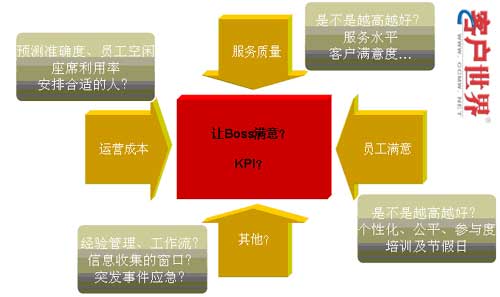 所以,我們認(rèn)為呼叫中心的運(yùn)營解決方案,應(yīng)該綜合協(xié)調(diào)人力資源管理、話務(wù)預(yù)測、自動排班、績效考評、話務(wù)分析、現(xiàn)場管理、實時預(yù)警等各個現(xiàn)場管理要素。各個要素之間即是相互獨(dú)立,又相互關(guān)聯(lián)的,系統(tǒng)通過設(shè)置目標(biāo)值,達(dá)到管理目標(biāo)的均衡,這個平衡,從最核心的體現(xiàn)來看,就是一個完整的KPI體系中各個指標(biāo)的實現(xiàn)。