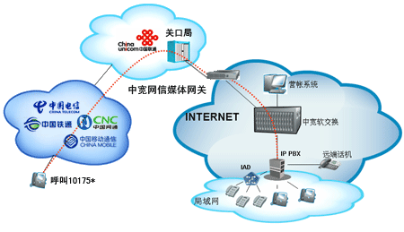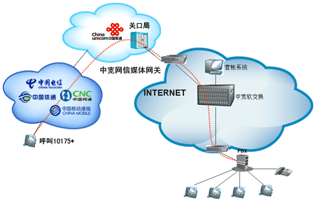 企業(yè)或個(gè)人自行從網(wǎng)站上成功申請(qǐng)“企業(yè)商務(wù)通”或“個(gè)人隨身行”業(yè)務(wù)后,通過(guò)101756*全國(guó)統(tǒng)一接入號(hào)結(jié)合中寬網(wǎng)信推薦的思科linksys網(wǎng)關(guān)或網(wǎng)絡(luò)電話使用,當(dāng)外部對(duì)您申請(qǐng)的10175*號(hào)碼發(fā)起呼叫時(shí),該呼叫通過(guò)中國(guó)聯(lián)通的線路將話務(wù)指向中寬網(wǎng)信的媒體網(wǎng)關(guān),由中寬軟交換平臺(tái)將呼叫送至您指定的電話上。另外,當(dāng)您使用該業(yè)務(wù)外呼時(shí),可以選擇在被叫電話上顯示10175*或隱藏號(hào)碼。