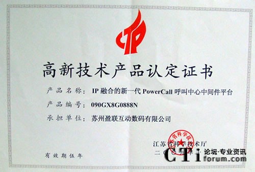 盈聯PowerCall呼叫中心中間件高新技術產品認定