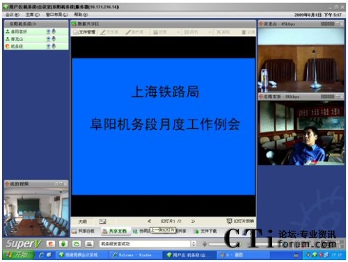 CTI論壇(ctiforum)08月06日消息: 日前,京九干線(xiàn)主力機(jī)務(wù)段——上海鐵路局阜陽(yáng)機(jī)務(wù)段成功啟動(dòng)視維Super-V視頻會(huì)議系統(tǒng)。阜陽(yáng)機(jī)務(wù)段的領(lǐng)導(dǎo)和職工,每天早上8點(diǎn)上班后,第一件事情就是登陸視頻會(huì)議系統(tǒng),匯報(bào)前日工作情況、部署當(dāng)日工作內(nèi)容。已然,山大聯(lián)潤(rùn)為上海路局阜陽(yáng)機(jī)務(wù)段部署的阜陽(yáng)機(jī)務(wù)段視頻會(huì)議系統(tǒng),成為鐵路部門(mén)必不可少的遠(yuǎn)程溝通交流工具,在有效提高鐵路系統(tǒng)溝通效率的同時(shí),保障了鐵路運(yùn)輸?shù)陌踩瑯O大滿(mǎn)足了鐵路部門(mén)暑期運(yùn)營(yíng)業(yè)務(wù)對(duì)溝通和會(huì)議的需求。