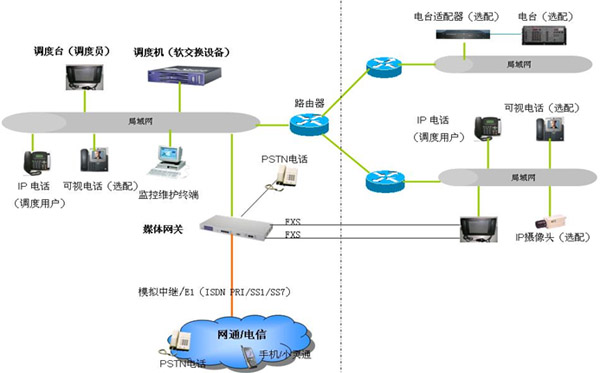 IP指揮調(diào)度語(yǔ)音通信系統(tǒng)由調(diào)度機(jī)、調(diào)度臺(tái)、媒體網(wǎng)關(guān)、IP電話、電臺(tái)適配器、電臺(tái)等設(shè)備組成,整體系統(tǒng)采用軟交換網(wǎng)絡(luò)的結(jié)構(gòu),構(gòu)建于以太網(wǎng)之上。傳輸網(wǎng)絡(luò)由通過(guò)路由器連接的多個(gè)局域網(wǎng)構(gòu)成;