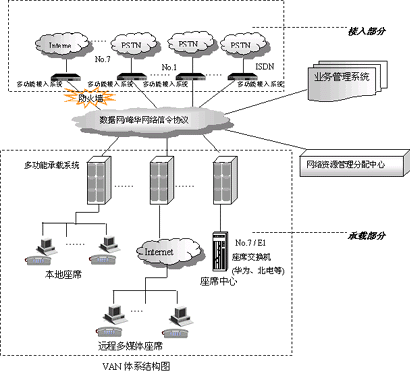 VAN(Voice Area Network)是一個支持多接入點、多承攬點、多業(yè)務(wù)點、多數(shù)據(jù)點的大型分布式呼叫中心構(gòu)造平臺。它針對大型分布式呼叫中心、企業(yè)營銷網(wǎng)絡(luò)及行業(yè)公共交換平臺的業(yè)務(wù)需求和技術(shù)需求開發(fā),支持多種接入方式并具備多種服務(wù)處理手段,同時可利用其軟件平臺——DCCMS呼叫管理系統(tǒng)對多種業(yè)務(wù)進(jìn)行分散式管理,對各類資源進(jìn)行統(tǒng)一控制,實現(xiàn)全網(wǎng)數(shù)據(jù)協(xié)同管理。