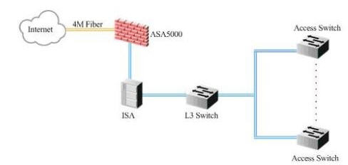辦公專(zhuān)用網(wǎng)通過(guò)一條4M光纖線(xiàn)路連入CNC網(wǎng)絡(luò),在酒店內(nèi)部安裝了ASA5000和ISA等安全管理設(shè)備,ISA承擔(dān)了NAT等功能;辦公網(wǎng)的信息點(diǎn)數(shù)量大概在200個(gè)左右。