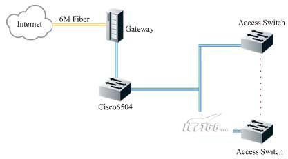 客房局域網(wǎng)通過一條6M的光纖接入CNC網(wǎng)絡(luò),網(wǎng)關(guān)設(shè)備承擔(dān)了DHCP、NAT和流量限制等功能,同時在思科6504上安裝有安全板卡,對內(nèi)部網(wǎng)絡(luò)安全進行加強和防御。由于每個客房有2~3個信息點,客房局域網(wǎng)總共有1300個左右的信息點。