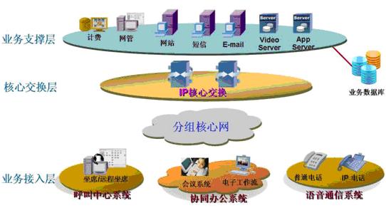 業(yè)務(wù)支撐層:計(jì)費(fèi)、網(wǎng)管、多媒體視頻、應(yīng)用服務(wù)器等各種功能服務(wù)器?膳c用戶的業(yè)務(wù)數(shù)據(jù)庫對(duì)接,為整個(gè)業(yè)務(wù)提供有力的支撐平臺(tái)。確保有效快速的處理呼叫流程、提高工作效率,評(píng)估呼叫中心的表現(xiàn)。
