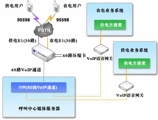 對于呼叫中心系統(tǒng),由95598特別號碼統(tǒng)一接入,并且在供電呼叫中心系統(tǒng)與農(nóng)電呼叫中心系統(tǒng)之間采用中繼方式(模擬中繼或者數(shù)字中繼,視農(nóng)電方實際情況而定)進行話路連接,同時保證系統(tǒng)接入容量及其他資源能夠滿足統(tǒng)一的要求;在自動語音菜單中,分別設立供、農(nóng)電用戶層,用戶可以自行區(qū)分、選擇,對于農(nóng)電用戶在確定用戶類型之后,通過中繼將話路轉接到農(nóng)電方呼叫中心系統(tǒng)。