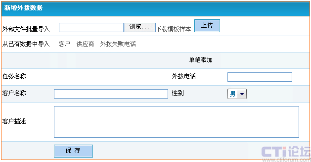 外撥數(shù)據(jù)管理:用來生成外撥所需要的電話號(hào)碼,可以從客戶資料庫(kù)、供應(yīng)商資料庫(kù)中調(diào)用,也可以手工填寫。同時(shí)支持外撥數(shù)據(jù)批量導(dǎo)入。