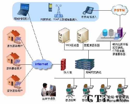 隨著國內(nèi)城市化地不斷加快,人口老齡化的加劇,人民群眾對家政服務需求也越來越旺盛,家政服務業(yè)的重要性也日益凸顯。為了規(guī)范家政服務市場、整合家政市場資源、培育家政服務示范性企業(yè),國家商務部、財務部于2009年4月下發(fā)了《關(guān)于推進家政服務網(wǎng)絡體系建設的通知》的149號文件,啟動了家政服務網(wǎng)絡中心體系建設的項目,并提出了具體的規(guī)范和要求。以此為起點,為更好地服務社會滿足人民群眾日益增長的生活需求而努力。自文件下發(fā)以來,我公司就組織專門的項目組,對家政服務行業(yè)具體業(yè)務需求的調(diào)研以及開發(fā)工作。公司利用多年的開發(fā)經(jīng)驗,經(jīng)過幾個月的努力,終于在8月份完成了暢信達家政服務網(wǎng)絡中心的全套建設方案。與其它系統(tǒng)固化的功能設計不同,該方案可以靈活地定制業(yè)務模塊,方便各地的家政公司根據(jù)本市的情況和需求,確定適合自身的業(yè)務流程。系統(tǒng)業(yè)務模塊完整地覆蓋了家政服務的業(yè)務范圍與重點。并將家政服務的業(yè)務分為營業(yè)系統(tǒng)、賬務系統(tǒng)、后臺系統(tǒng)等部分,貫穿了市民從訴求提交、工單派發(fā)、工單處理、財務結(jié)算到回訪反饋的各個方面。系統(tǒng)還提供了完善的報表模塊準確反映業(yè)務和系統(tǒng)運營狀況,有力地支持對平臺進行運營管理工作。另外在方案設計上,除了滿足業(yè)務處理需要外,還充分考慮到系統(tǒng)的適應性、穩(wěn)定性和處理的能力。首先為了滿足各地市對家政平臺的不同需求,公司專門推出了基于IBM服務器的和暢信達標配服務器的兩種建設方案。暢信達標配服務器方案可提供最低4模擬外線最多1條數(shù)字中繼(E1)接入,適用于初期規(guī)模較小且投資規(guī)模不大的客戶。而基于IBM服務器的方案,則主要是滿足業(yè)務量較大,同時對設備配置要求高的城市,以數(shù)字線接入為主。多種建設模式充分體現(xiàn)了方案的靈活性、可擴展性的特征,有效地減少了運營風險,提升了個性化定制化服務的水平。其次,根據(jù)家政市場需求預測以及已開通家政服務網(wǎng)絡中心城市的實際運營情況,一個中型城市,預計電話開通之后,話務量平均每天近3000個,這就要求系統(tǒng)不但有穩(wěn)定的性能而且要有強大的處理能力。我公司從系統(tǒng)平臺構(gòu)建、業(yè)務流程設計、設備性能、組網(wǎng)設計等方面著手,為系統(tǒng)提供了足以確保安全穩(wěn)定運行的支持。