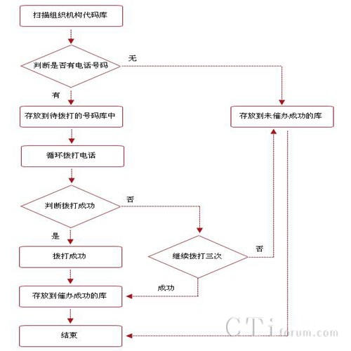 催辦業(yè)務負責完成語音提示。系統(tǒng)自動掃描組織機構(gòu)代碼庫,查詢當日需要年檢的組織機構(gòu)代碼信息,對沒有電話號碼的存入到未催辦的組織機構(gòu)代碼庫中,有電話號碼的存入到待催辦的電話號碼庫中,并根據(jù)設(shè)置的時間撥打手機號碼,對于語音提示成功的,存放到相應的庫中。催辦業(yè)務后臺功能包括: