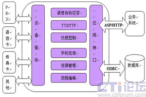 CTI服務(wù)器是整個系統(tǒng)的核心,通過內(nèi)置電話語音/傳真卡,接入PSTN電話網(wǎng)。該服務(wù)器可作為一個相對獨立的系統(tǒng)單獨運行,也可以通過企業(yè)局域網(wǎng)與企業(yè)的業(yè)務(wù)系統(tǒng)連接。