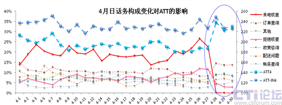 上面是從整月數(shù)據(jù)分析話務(wù)構(gòu)成對ATT的影響,下面從日數(shù)據(jù)分析導(dǎo)致4月ATT“月末彈起”現(xiàn)象的原因。(下圖12)