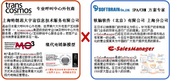 順應(yīng)這一市場(chǎng)需求,兩家來(lái)自日本的分別在各自領(lǐng)域具有一流實(shí)力與經(jīng)驗(yàn)的呼叫中心外包商及專業(yè)SFA/CRM開(kāi)發(fā)商決定聯(lián)合舉辦針對(duì)金融企業(yè)客戶的實(shí)際應(yīng)用會(huì)議。2006年獲得全球呼叫中心獎(jiǎng)的transcosmos公司與日本SFA市場(chǎng)連續(xù)3年市場(chǎng)占有率第一的軟腦軟件(Softbrain)將攜手推出關(guān)于如何有效進(jìn)行需求發(fā)掘、提高簽約率的方案分享。同時(shí)也是一場(chǎng)關(guān)于金融行業(yè)營(yíng)銷服務(wù)創(chuàng)新的直面金融用戶的交流與匯報(bào),愿與各金融客戶企業(yè)一起探討如何更好的提高需求發(fā)掘的效率,如何更有效地將靠個(gè)人管理的營(yíng)業(yè)過(guò)程與售后跟進(jìn)進(jìn)行組織化的管理。
