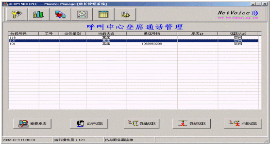 系統(tǒng)提供實時直觀的監(jiān)控界面,并提供各類實用的坐席監(jiān)控方法如:監(jiān)聽、強(qiáng)插、強(qiáng)拆等功能操作,從而實現(xiàn)了對各應(yīng)用坐席的強(qiáng)有力的監(jiān)控、管理功能。
