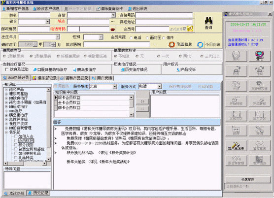 諾和關懷糖尿病服務中心的服務坐席可以實現(xiàn)患者信息的同步提示功能,當電話被分配至坐席的同時,患者的資料信息也同步出現(xiàn)在PC終端上。同時坐席終端可以自動記錄對方的電話號碼,也可以實時顯示正在排隊等待的人數(shù),提示服務人員加快業(yè)務受理速度。