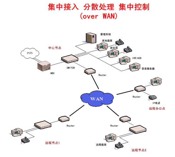 隨著用戶分支機(jī)構(gòu)的不斷發(fā)展壯大,建立一套完全基于IP網(wǎng)絡(luò)的分布式的呼叫中心系統(tǒng),正成為企業(yè)全面提升自身客戶服務(wù)質(zhì)量的一條重要途徑。在前幾年的呼叫中心建設(shè)熱潮過(guò)后,現(xiàn)在的市場(chǎng)越來(lái)越趨向于理性,目前的企業(yè)往往都處在轉(zhuǎn)變之中,如何最大限度地利用現(xiàn)有的網(wǎng)絡(luò)資源和已有的設(shè)備資源,如何以最低的投資成本獲得最有效的客戶服務(wù)手段才是企業(yè)的選擇根本。企業(yè)的需求決定了呼叫中心行業(yè)的發(fā)展方向,網(wǎng)絡(luò)化、分布化、經(jīng)濟(jì)化、完全基于IP的華為-3Com NBX呼叫中心平臺(tái)越來(lái)越受到企業(yè)的歡迎,已經(jīng)成為企業(yè)構(gòu)建IP分布式客戶服務(wù)系統(tǒng)的首選品牌。基于網(wǎng)絡(luò)化的NBX呼叫中心: