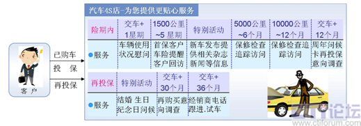 根據(jù)詳細(xì)的客戶或交易信息(如生日、性別、愛好、購(gòu)車記錄、投保記錄等)主動(dòng)與客戶通過電話、短信等方式,進(jìn)行客戶回訪、投保到期再保提醒、生日祝福、節(jié)日問候、再保后的關(guān)懷等服務(wù),與客戶建立良好的長(zhǎng)期關(guān)系。