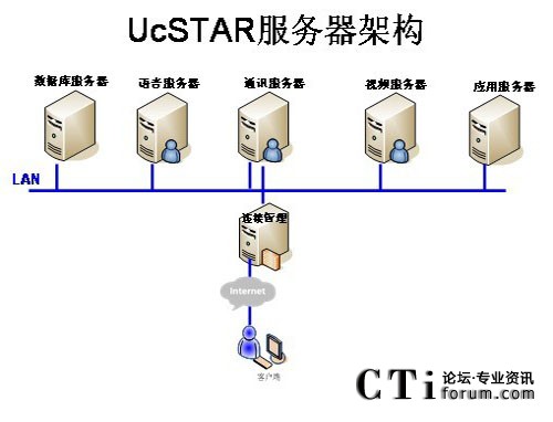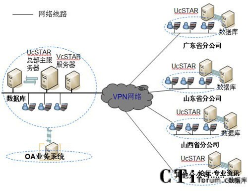 在公司總部部署主UcSTAR服務(wù)器,全國省級(jí)分公司分別部署一套子UcSTAR服務(wù)器,組成星型結(jié)構(gòu)公司內(nèi)部的溝通與協(xié)作系統(tǒng)。