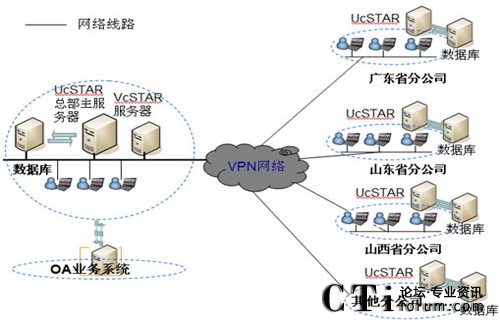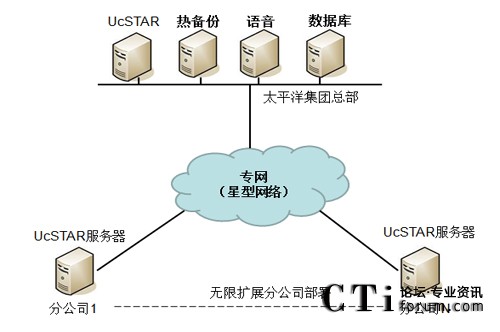 在公司總部部署主UcSTAR服務器,全國省級分公司分別部署一套子UcSTAR服務器,組成星型結構公司內部的溝通與協作系統(tǒng)。