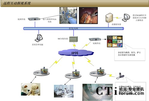 在各個病房、探視房間、會議室部署探視終端,在合適的角度部署攝像機,在中心機房配置 MCU服務器,即可實現(xiàn)可視對講、遠程醫(yī)療探視;