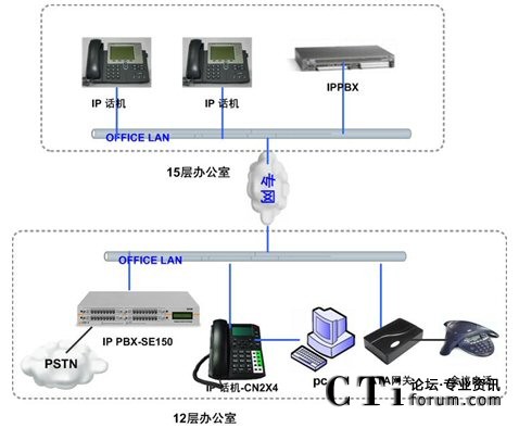 隨著企業(yè)規(guī)模的不斷擴(kuò)展,公司在15層新增約50人的辦公區(qū),需要和12層實(shí)現(xiàn)內(nèi)部通訊免費(fèi)(直撥分機(jī)號碼),出局路由沿用現(xiàn)有ISDN線路,F(xiàn)有的傳統(tǒng)的集團(tuán)電話設(shè)備已經(jīng)滿配,無法適應(yīng)企業(yè)規(guī)模的擴(kuò)張,無法跨地域組網(wǎng),不能建立多點(diǎn)分布式的內(nèi)部電話系統(tǒng),不能充分利用現(xiàn)有的IP網(wǎng)絡(luò)資源發(fā)展有助于提高企業(yè)競爭力的網(wǎng)絡(luò)增值業(yè)務(wù)。