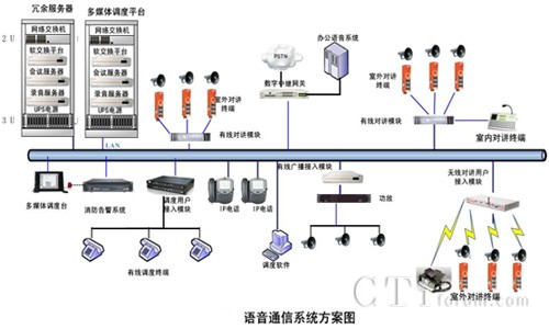 整體解決方案由軟交換服務器、會議服務器、錄音服務器、數字中繼網關、調度臺、有線對講模塊、有線廣播模塊、無線對講模塊等幾部分組成,系統(tǒng)基于IP網絡部署,所有設備均直接接入到IP網絡上,通過IP網絡匯聚到指揮中心進行交換和統(tǒng)一管理調度。