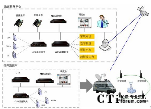 整體系統(tǒng)由地面指揮中心和指揮通信車組成,指揮中心和通信車分別部署調度臺,均可指揮現(xiàn)場。地面指揮中心和指揮通信車通過部署衛(wèi)星設備,通過衛(wèi)星鏈路進行通信,當衛(wèi)星鏈路出現(xiàn)故障時,指揮車也可通過移動網絡(GSM/CDMA/3G)與地面指揮中心互聯(lián)互通。