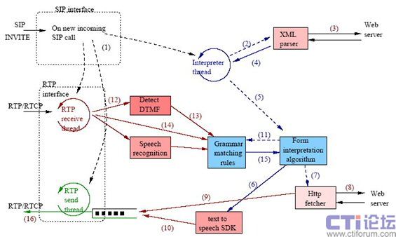 1. 當(dāng)瀏覽器接收到一個新進(jìn)來的SIP呼叫后,它創(chuàng)建三個不同線程:RTP接收線程、RTP發(fā)送線程和VoiceXML解釋器線程。RTP接收線程從主叫方接收媒體數(shù)據(jù)包并調(diào)用DTMF檢測模塊;RTP發(fā)送線程將媒體數(shù)據(jù)包以流的方式發(fā)送給主叫方。一個單獨(dú)的發(fā)送線程幫助維護(hù)外出數(shù)據(jù)報的固定帶寬(比如針對G.711音頻的64