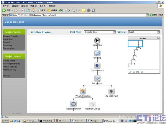Home,在打開的Voxeo Prophecy網(wǎng)頁中點(diǎn)擊Prophecy Designer即開始了我們創(chuàng)建VoiceXML項(xiàng)目的輕松之旅。該設(shè)計工具將整個VoiceXML應(yīng)用以圖表或樹狀結(jié)構(gòu)直觀地呈現(xiàn)給開發(fā)者,可以方便地控制和修改其交互流程,如圖3所示。