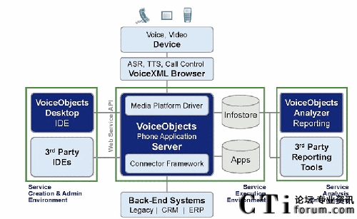 VoiceObjects體系結(jié)構(gòu)支持輕松地開發(fā)、部署和維護帶有語音、視頻、文本和移動互聯(lián)網(wǎng)接口的電話應用。通過緊密集成提供實時分析的VoiceObjects分析器和提供應用創(chuàng)建與維護的VoiceObjects桌面,VoiceObjects服務器成為提供動態(tài)對話和接口生成的執(zhí)行引擎。