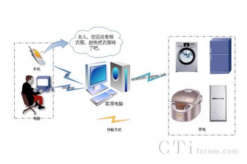 家電遠控系統(tǒng)的原理是利用電腦或者手機的電源管理系統(tǒng),來管理用戶終端軟件管理電源的開關、定時、預設時間等,利用互聯(lián)網(wǎng)或者手機網(wǎng)絡把信號傳輸?shù)郊彝ル娔X,家庭電腦當作小型服務器或者信號轉發(fā)點,把信號利用藍牙、zigbee、wifi等無線傳輸?shù)街付ǖ碾娫床遄,當然每個電源插座都要有相應的信號接收模塊實現(xiàn)和家庭電腦的信號傳輸,實現(xiàn)了對電源的管理功能。家電遠控終端軟件嵌入語音合成軟件,利用合成語音報讀預設的提醒內容和時間提醒,具有危急情況下的報警功能。當然如果我們是在家里,可以直接用手機通過藍牙對電源插座進行管理,或者通過家庭電腦進行管理。如圖所示: