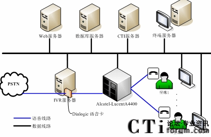 整個(gè)呼叫中心分存在兩種通訊方式:語(yǔ)音方式和數(shù)據(jù)方式。語(yǔ)音方式指的是傳統(tǒng)的電話線路,數(shù)據(jù)方式則是指的是各個(gè)應(yīng)用程序間的通訊交互線路。管理語(yǔ)音硬件的有Dialogic語(yǔ)音卡—負(fù)責(zé)整個(gè)系統(tǒng)的語(yǔ)音接入,并處理自動(dòng)語(yǔ)音的相關(guān)動(dòng)作;Alcatel-lucent