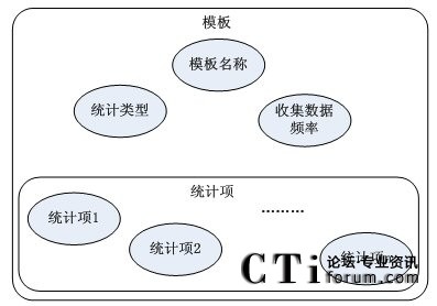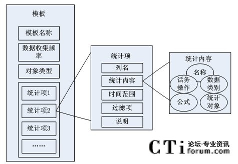 由模板結構框架圖得知,模板包括模板名稱,數(shù)據(jù)統(tǒng)計對象,收集數(shù)據(jù)的頻率和多個基本統(tǒng)計項。其中,每個統(tǒng)計項對應著統(tǒng)計對象(如:坐席,路由點等)的一條統(tǒng)計內容信息(如:1小時內的呼叫總量等)。然后由這些統(tǒng)計項和統(tǒng)計參數(shù)組合成模板,從而構成對呼叫中心對象的統(tǒng)計信息。