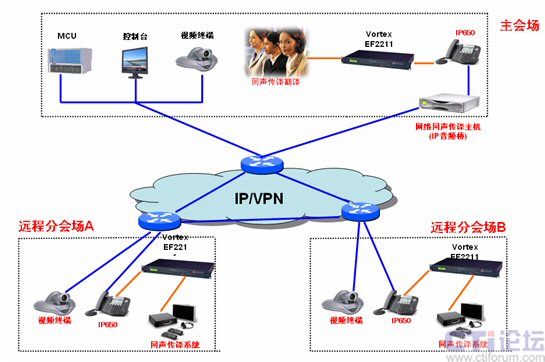 當(dāng)視頻會議召開時,主會場的翻譯既通過同聲傳譯系統(tǒng)把翻譯好的內(nèi)容傳輸?shù)奖镜氐呐c會者,也通過IP音頻會議系統(tǒng)把翻譯好的內(nèi)容傳輸?shù)竭h(yuǎn)端的會場,遠(yuǎn)端會場把音頻系統(tǒng)傳輸過來的聲音經(jīng)過EF2211聲音處理系統(tǒng)處理后傳輸?shù)酵晜髯g系統(tǒng),同聲傳譯系統(tǒng)把聲音經(jīng)無線耳機傳送給需要的與會者。這樣遠(yuǎn)端會場的與會者既可以聽到主會場的原聲,也可以聽到翻譯好的內(nèi)容。相反,當(dāng)分會場發(fā)言時分會場也可以把本會場的原聲和翻譯好的內(nèi)容傳輸?shù)街鲿䦂。這樣就可以實現(xiàn)遠(yuǎn)程同聲傳譯。能同時滿足與會的所有人員的翻譯需求,既做到翻譯內(nèi)容的統(tǒng)一,又節(jié)省了翻譯人員的人力成本。