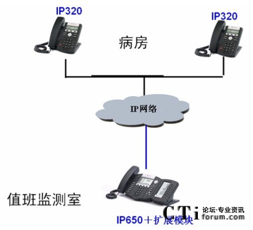 病房的IP550話機(jī)可以設(shè)置成摘機(jī)直通值班室的熱線模式,病房只要拿起聽筒,電話自動(dòng)接通值班室,無需撥號(hào)。如果需要,病房同樣也可將IP550上設(shè)置成一鍵通話模式,定義值班室的快速通話按鍵,出現(xiàn)問題時(shí)一鍵接通值班室。